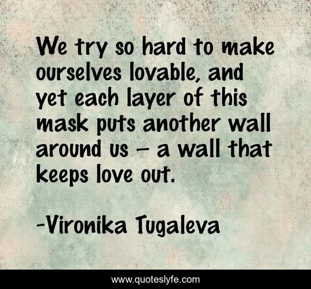 This page presents the quote "We try so hard to make ourselves lovable, and yet each layer of this mask puts another wall around us – a wall that keeps love out.". Author of this quote is Vironika Tugaleva. This quote is about self-love, love, be-yourself, mask, lovable, authentic-self, authenticity, self-awareness, affection,.