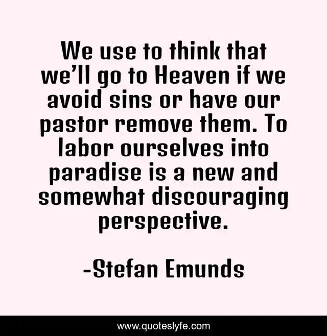 This page presents the quote "We use to think that we’ll go to Heaven if we avoid sins or have our pastor remove them. To labor ourselves into paradise is a new and somewhat discouraging perspective.". Author of this quote is Stefan Emunds. This quote is about christ, revelation, doomsday, spirituality-vs-religion, mysticism, apocalypse, end-of-days, second-coming,.