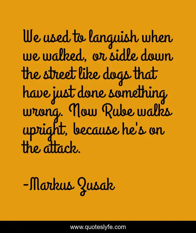 This page presents the quote "We used to languish when we walked, or sidle down the street like dogs that have just done something wrong. Now Rube walks upright, because he's on the attack.". Author of this quote is Markus Zusak. This quote is about sidle, attack, pride, languish, walk-upright,.