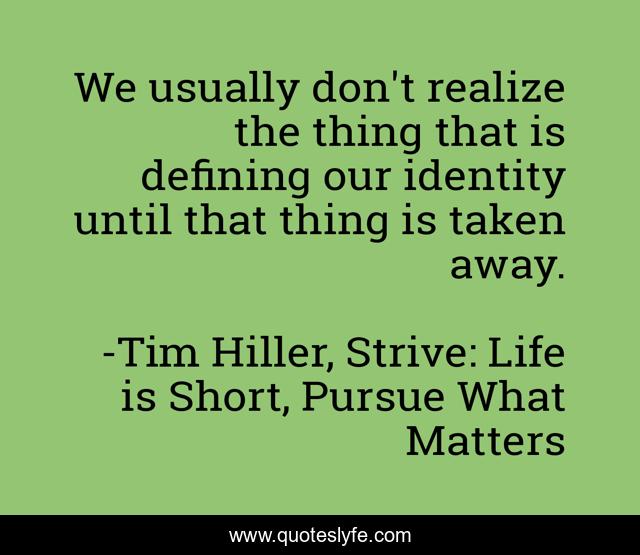 This page presents the quote "We usually don't realize the thing that is defining our identity until that thing is taken away.". Author of this quote is Tim Hiller, Strive: Life is Short, Pursue What Matters. This quote is about defining-yourself, defining, identity, identity-crisis,.