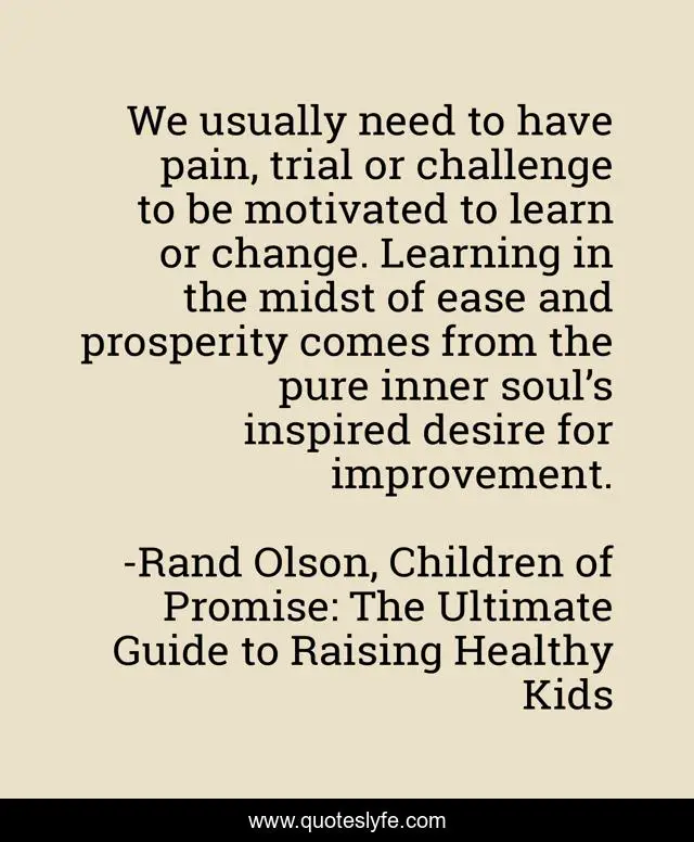This page presents the quote "We usually need to have pain, trial or challenge to be motivated to learn or change. Learning in the midst of ease and prosperity comes from the pure inner soul’s inspired desire for improvement.". Author of this quote is Rand Olson, Children of Promise: The Ultimate Guide to Raising Healthy Kids. This quote is about parenting, health, spirituality,.