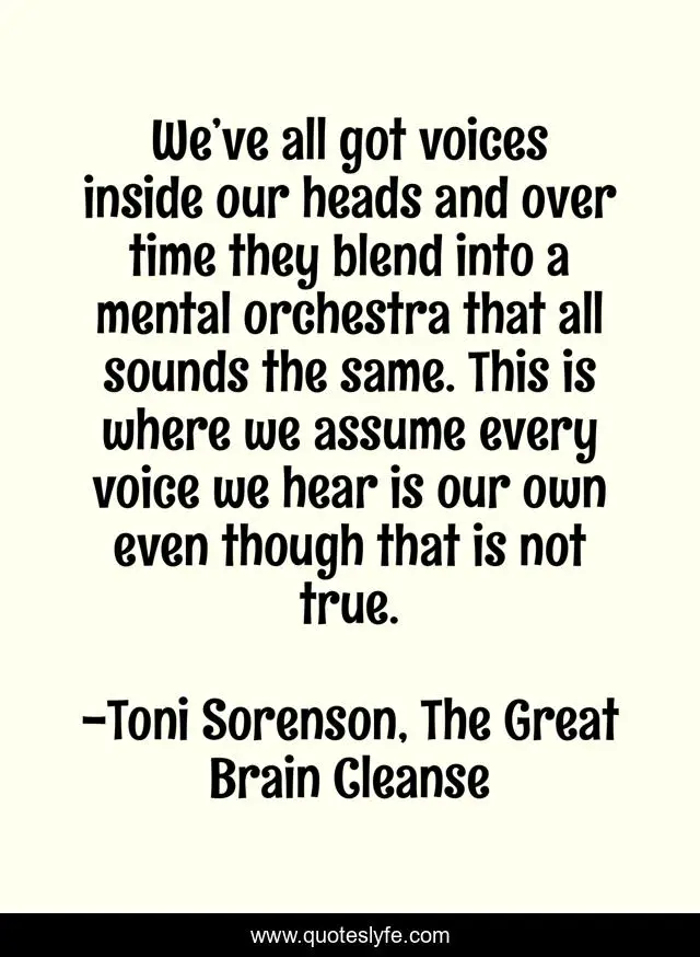 This page presents the quote "We’ve all got voices inside our heads and over time they blend into a mental orchestra that all sounds the same. This is where we assume every voice we hear is our own even though that is not true.". Author of this quote is Toni Sorenson, The Great Brain Cleanse. This quote is about brain, inner-voice, life, thoughts,.