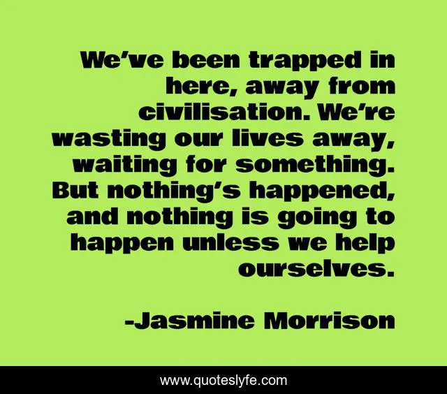 This page presents the quote "We’ve been trapped in here, away from civilisation. We’re wasting our lives away, waiting for something. But nothing’s happened, and nothing is going to happen unless we help ourselves.". Author of this quote is Jasmine Morrison. This quote is about enthusiasm, young-adult-fiction, inspirational,.