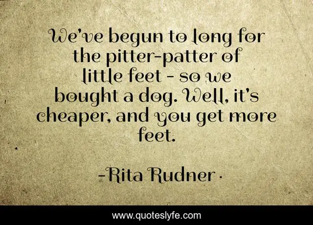 This page presents the quote "We've begun to long for the pitter-patter of little feet - so we bought a dog. Well, it's cheaper, and you get more feet.". Author of this quote is Rita Rudner. This quote is about feet, dog, long,.