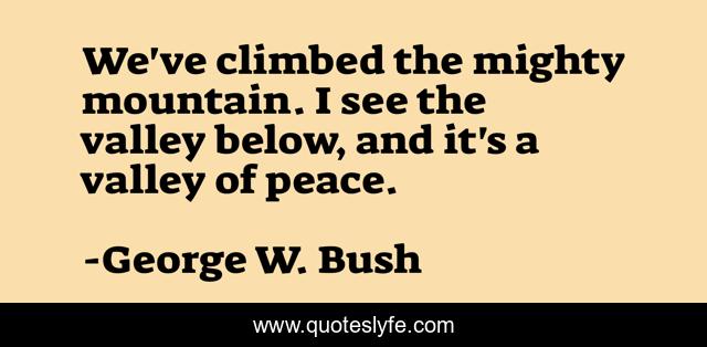This page presents the quote "We've climbed the mighty mountain. I see the valley below, and it's a valley of peace.". Author of this quote is George W. Bush. This quote is about mountain, see, mighty,.