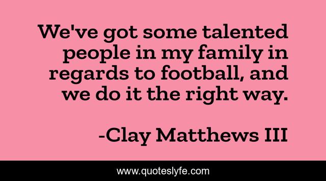 This page presents the quote "We've got some talented people in my family in regards to football, and we do it the right way.". Author of this quote is Clay Matthews III. This quote is about football, way, people,.