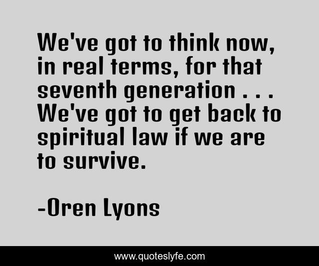 This page presents the quote "We've got to think now, in real terms, for that seventh generation . . . We've got to get back to spiritual law if we are to survive.". Author of this quote is Oren Lyons. This quote is about sustainability, indigenous, inspiration, wisdom,.