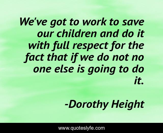 This page presents the quote "We've got to work to save our children and do it with full respect for the fact that if we do not no one else is going to do it.". Author of this quote is Dorothy Height. This quote is about helping, people,.