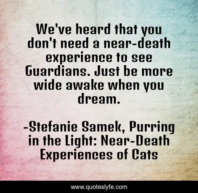 This page presents the quote "We've heard that you don't need a near-death experience to see Guardians. Just be more wide awake when you dream.". Author of this quote is Stefanie Samek, Purring in the Light: Near-Death Experiences of Cats. This quote is about guardians, cats, nde, dreams,.