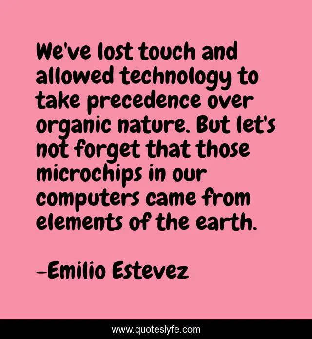 This page presents the quote "We've lost touch and allowed technology to take precedence over organic nature. But let's not forget that those microchips in our computers came from elements of the earth.". Author of this quote is Emilio Estevez. This quote is about technology, lost, nature,.