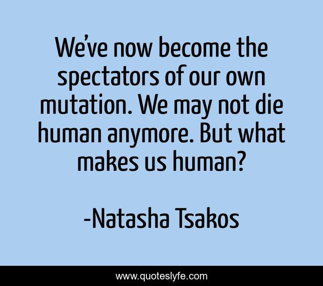 This page presents the quote "We’ve now become the spectators of our own mutation. We may not die human anymore. But what makes us human?". Author of this quote is Natasha Tsakos. This quote is about alive, humanity, mutation, human, advancement,.