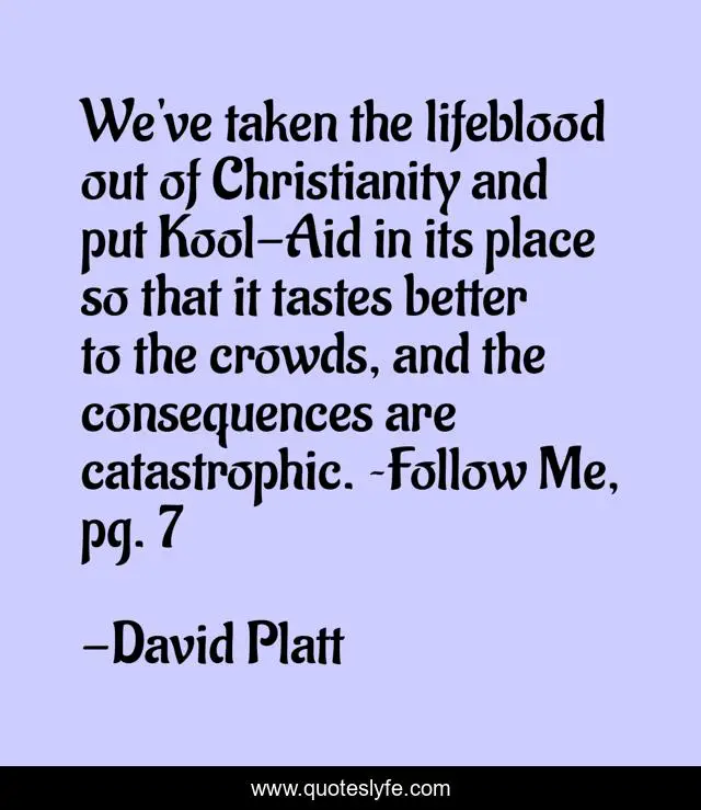 This page presents the quote "We've taken the lifeblood out of Christianity and put Kool-Aid in its place so that it tastes better to the crowds, and the consequences are catastrophic. ~Follow Me, pg. 7". Author of this quote is David Platt. This quote is about jesus-christ, follow-me, christianity, christian-life, discipleship, disciple-making,.