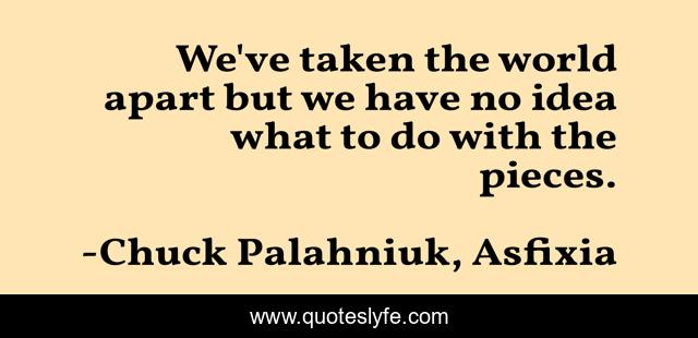 "Chuck Palahniuk, Asfixia Quotes." Quoteslyfe.com, 2025. Sat. 06 Dec. 2025. <https://www.quoteslyfe.com/quote/We-ve-taken-the-world-apart-but-89063>.