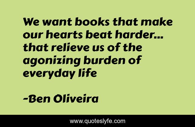 This page presents the quote "We want books that make our hearts beat harder... that relieve us of the agonizing burden of everyday life". Author of this quote is Ben Oliveira. This quote is about writer, relieve, emotions, everyday-life, books, bookworm, booknerd, reader, hearts,.