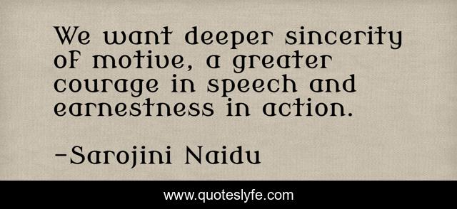 This page presents the quote "We want deeper sincerity of motive, a greater courage in speech and earnestness in action.". Author of this quote is Sarojini Naidu. This quote is about action, earnestness, courage, speech,.