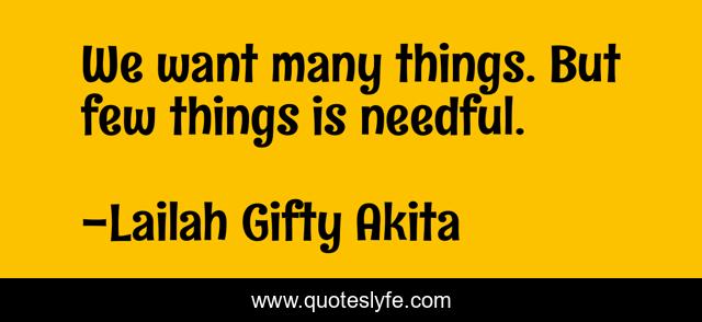 This page presents the quote "We want many things. But few things is needful.". Author of this quote is Lailah Gifty Akita. This quote is about living, wise-words, christian, life, things-that-matter-in-life, needs,.
