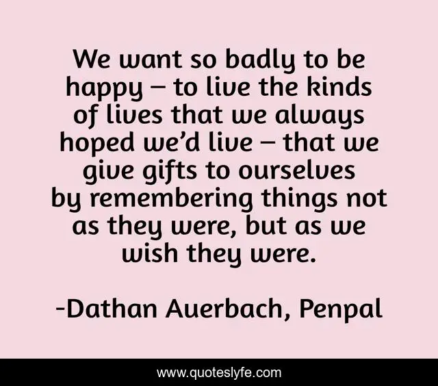This page presents the quote "We want so badly to be happy – to live the kinds of lives that we always hoped we’d live – that we give gifts to ourselves by remembering things not as they were, but as we wish they were.". Author of this quote is Dathan Auerbach, Penpal. This quote is about remembering, life, memories, forgetting, memory, happiness, wishful-thinking,.