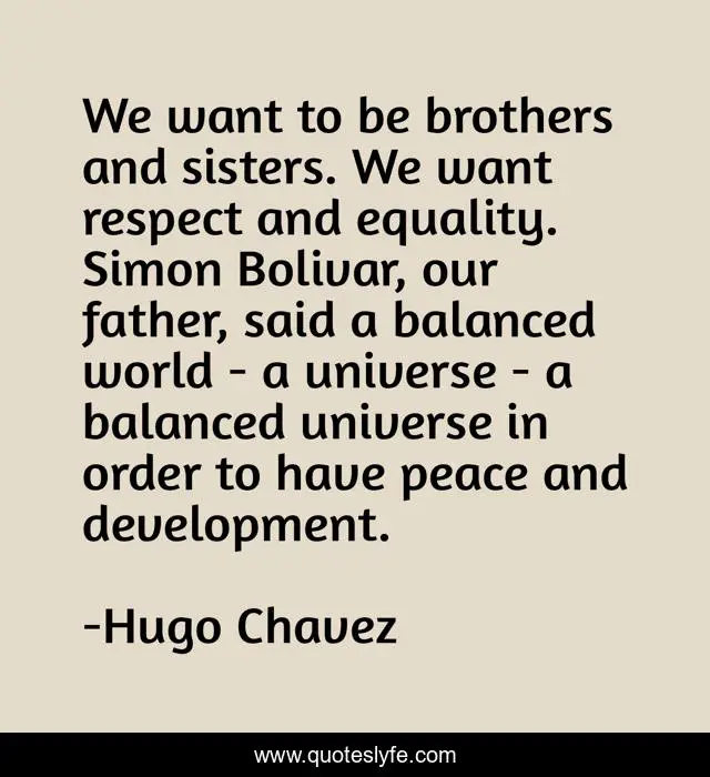 This page presents the quote "We want to be brothers and sisters. We want respect and equality. Simon Bolivar, our father, said a balanced world - a universe - a balanced universe in order to have peace and development.". Author of this quote is Hugo Chavez. This quote is about father, peace, equality,.