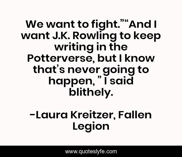 This page presents the quote "We want to fight.”“And I want J.K. Rowling to keep writing in the Potterverse, but I know that’s never going to happen, ” I said blithely.". Author of this quote is Laura Kreitzer, Fallen Legion. This quote is about humor, laura-kreitzer, j-k-rowling, fantasy, paranormal, fiction, timeless-series, fallen-legion, potterverse,.