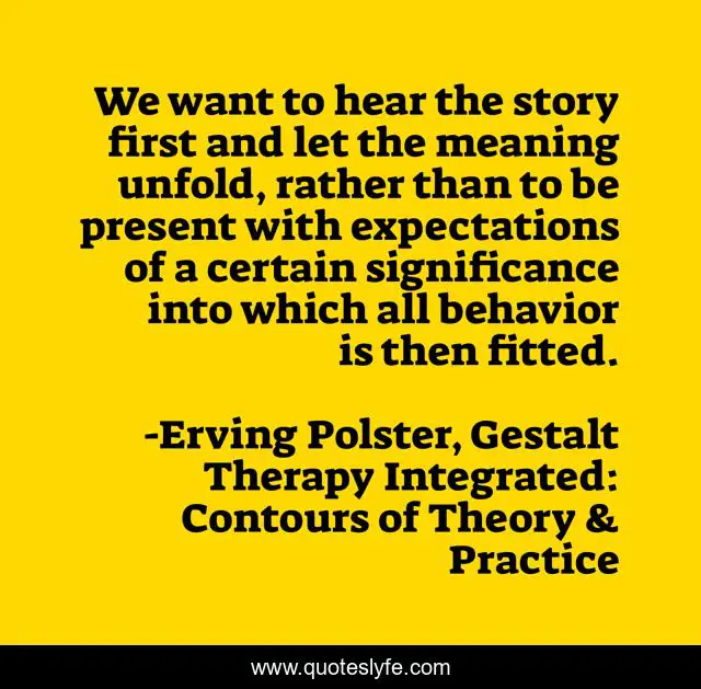 This page presents the quote "We want to hear the story first and let the meaning unfold, rather than to be present with expectations of a certain significance into which all behavior is then fitted.". Author of this quote is Erving Polster, Gestalt Therapy Integrated: Contours of Theory & Practice. This quote is about meaning, expectations, experience,.