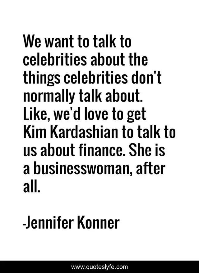 This page presents the quote "We want to talk to celebrities about the things celebrities don't normally talk about. Like, we'd love to get Kim Kardashian to talk to us about finance. She is a businesswoman, after all.". Author of this quote is Jennifer Konner. This quote is about love, she, affection,.