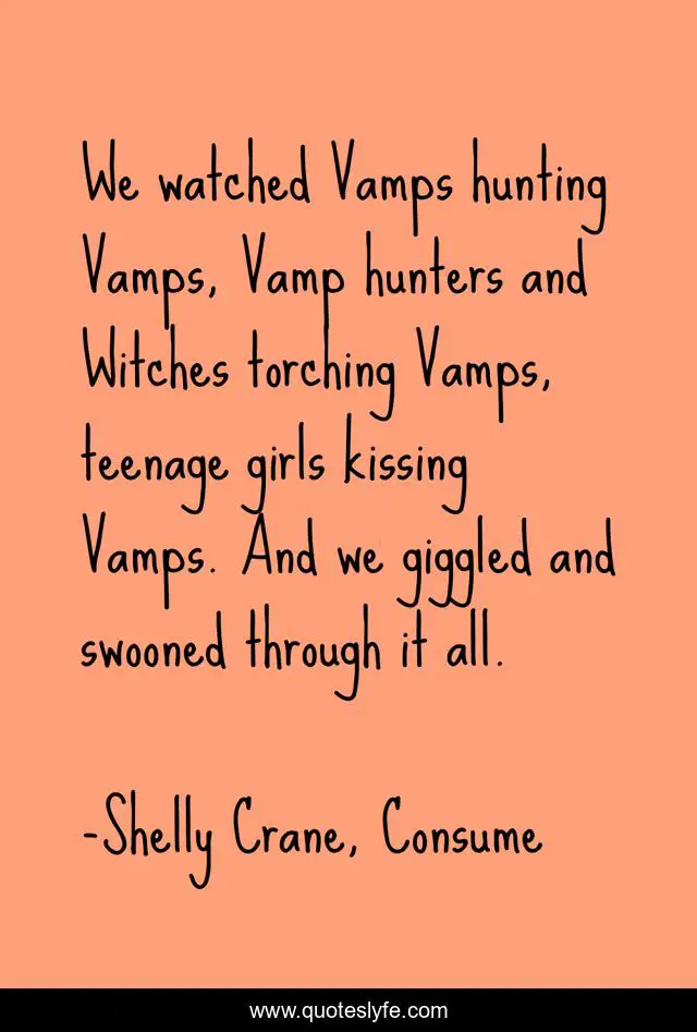 This page presents the quote "We watched Vamps hunting Vamps, Vamp hunters and Witches torching Vamps, teenage girls kissing Vamps. And we giggled and swooned through it all.". Author of this quote is Shelly Crane, Consume. This quote is about vamps, humor, vampires, girls-night, sleepovers, movie-night, teenagers,.