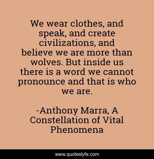 This page presents the quote "We wear clothes, and speak, and create civilizations, and believe we are more than wolves. But inside us there is a word we cannot pronounce and that is who we are.". Author of this quote is Anthony Marra, A Constellation of Vital Phenomena. This quote is about self, civilization, humanity,.