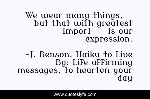 This page presents the quote "We wear many things, but that with greatest import is our expression.". Author of this quote is J. Benson, Haiku to Live By: Life affirming messages, to hearten your day. This quote is about haikus, love, peace, poetry, friendship-and-love, harmony, haiku, friendship, affection,.