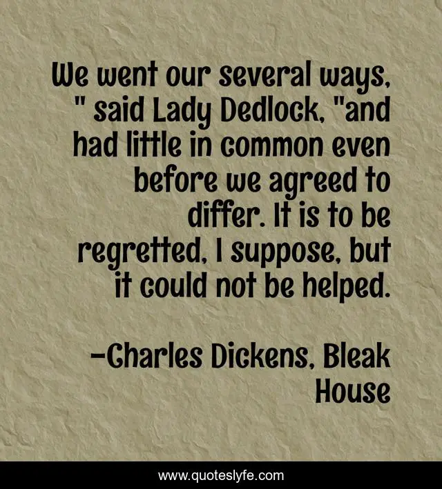 This page presents the quote "We went our several ways, " said Lady Dedlock, "and had little in common even before we agreed to differ. It is to be regretted, I suppose, but it could not be helped.". Author of this quote is Charles Dickens, Bleak House. This quote is about estranged, dedlock, differ, sisters, family,.