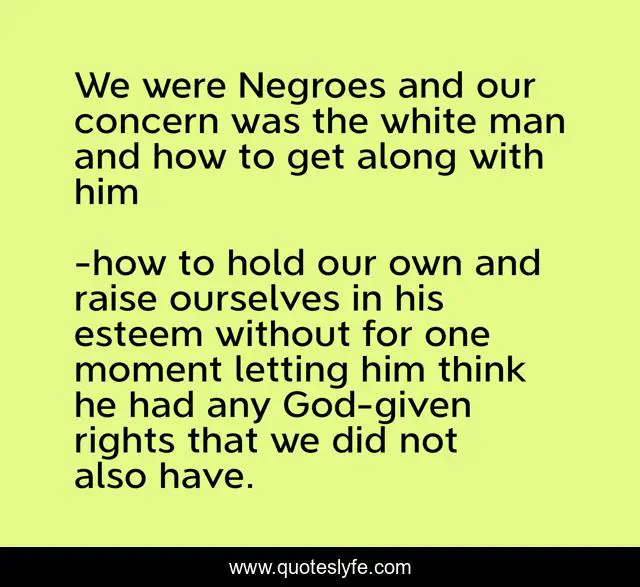 "how to hold our own and raise ourselves in his esteem without for one moment letting him think he had any God-given rights that we did not also have. Quotes." Quoteslyfe.com, 2025. Mon. 08 Dec. 2025. <https://www.quoteslyfe.com/quote/We-were-Negroes-and-our-concern-was-208475>.