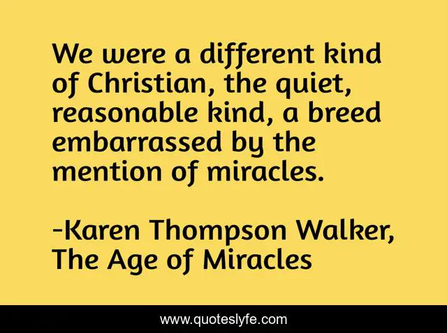 This page presents the quote "We were a different kind of Christian, the quiet, reasonable kind, a breed embarrassed by the mention of miracles.". Author of this quote is Karen Thompson Walker, The Age of Miracles. This quote is about miracles, christianity,.