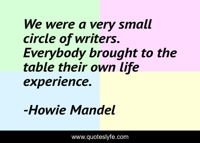 This page presents the quote "We were a very small circle of writers. Everybody brought to the table their own life experience.". Author of this quote is Howie Mandel. This quote is about small, life, circle,.