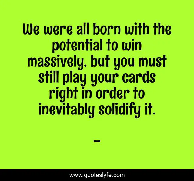 This page presents the quote "We were all born with the potential to win massively, but you must still play your cards right in order to inevitably solidify it.". Author of this quote is . This quote is about massive-success, play-your-cards-right, edmond-mbiaka, we-were-all-born-to-win, playing-your-cards-right, massive-win, massively,.