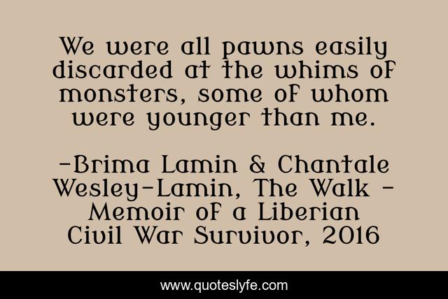 "Brima Lamin & Chantale Wesley-Lamin, The Walk - Memoir of a Liberian Civil War Survivor, 2016 Quotes." Quoteslyfe.com, 2025. Fri. 05 Dec. 2025. <https://www.quoteslyfe.com/quote/We-were-all-pawns-easily-discarded-at-52943>.
