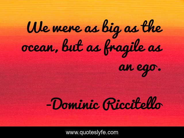 This page presents the quote "We were as big as the ocean, but as fragile as an ego.". Author of this quote is Dominic Riccitello. This quote is about life, metaphor, quote, fragile, ocean, truth, hurt, thoughts,.