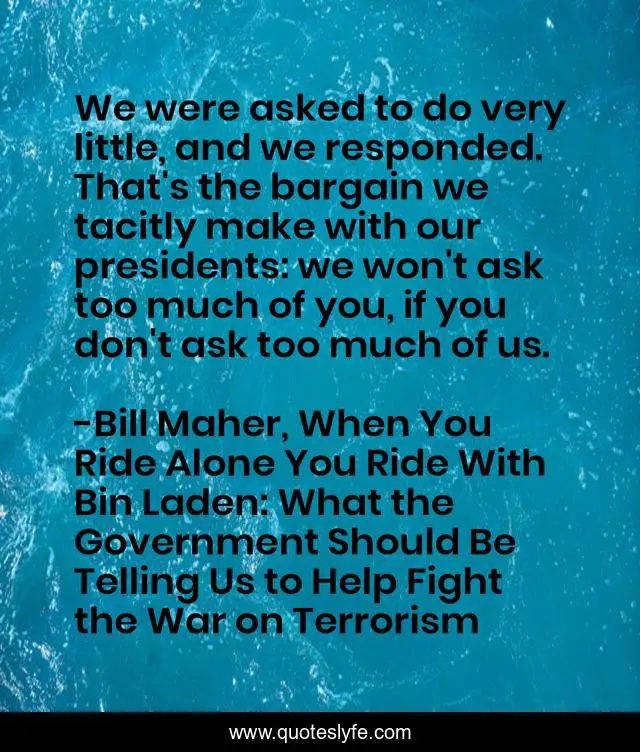 This page presents the quote "We were asked to do very little, and we responded. That's the bargain we tacitly make with our presidents: we won't ask too much of you, if you don't ask too much of us.". Author of this quote is Bill Maher, When You Ride Alone You Ride With Bin Laden: What the Government Should Be Telling Us to Help Fight the War on Terrorism. This quote is about unwilling, america, patriotism, war-on-terror,.