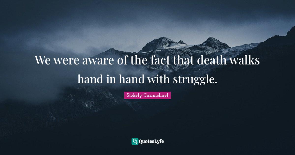 This page presents the quote "We were aware of the fact that death walks hand in hand with struggle.". Author of this quote is Stokely Carmichael. This quote is about struggle, fact, hand,.