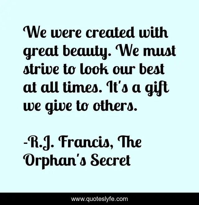 This page presents the quote "We were created with great beauty. We must strive to look our best at all times. It's a gift we give to others.". Author of this quote is R.J. Francis, The Orphan's Secret. This quote is about attractiveness, enthusiasm, beauty, inspirational, love-yourself,.