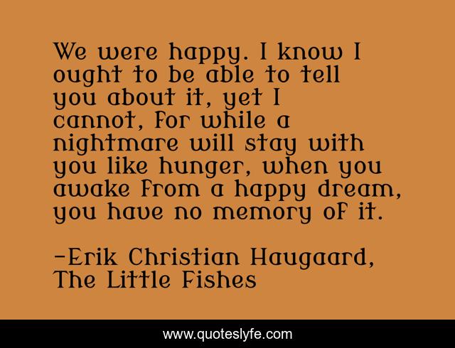 This page presents the quote "We were happy. I know I ought to be able to tell you about it, yet I cannot, for while a nightmare will stay with you like hunger, when you awake from a happy dream, you have no memory of it.". Author of this quote is Erik Christian Haugaard, The Little Fishes. This quote is about nightmare, dream, happiness,.