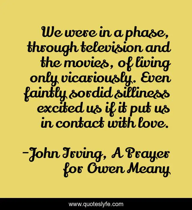This page presents the quote "We were in a phase, through television and the movies, of living only vicariously. Even faintly sordid silliness excited us if it put us in contact with love.". Author of this quote is John Irving, A Prayer for Owen Meany. This quote is about youth, love, affection,.