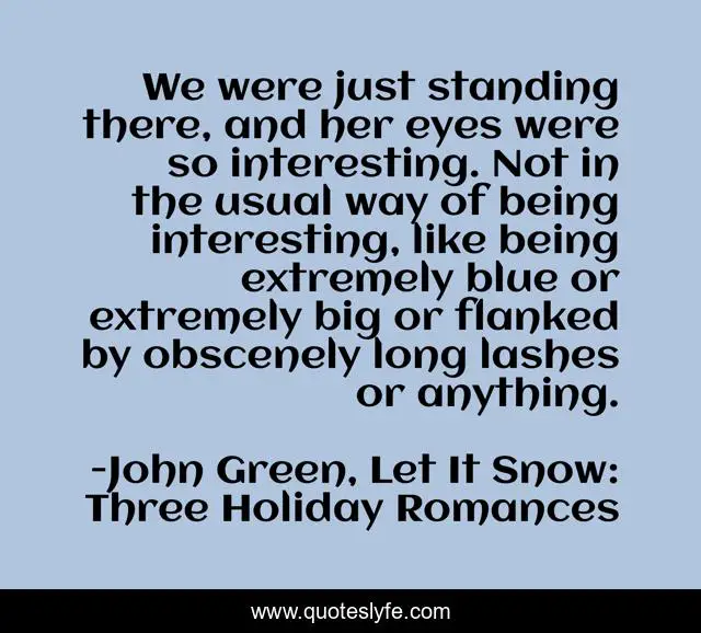 This page presents the quote "We were just standing there, and her eyes were so interesting. Not in the usual way of being interesting, like being extremely blue or extremely big or flanked by obscenely long lashes or anything.". Author of this quote is John Green, Let It Snow: Three Holiday Romances. This quote is about interesting, eyes, falling-in-love, love, affection,.