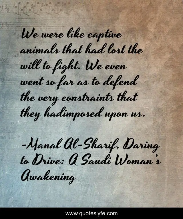 This page presents the quote "We were like captive animals that had lost the will to fight. We even went so far as to defend the very constraints that they hadimposed upon us.". Author of this quote is Manal Al-Sharif, Daring to Drive: A Saudi Woman’s Awakening. This quote is about manal-al-sharif, saudi-arabia, equality, driving, saudi-women, women-s-rights, daring-to-drive, patriarchal-society, inequality,.