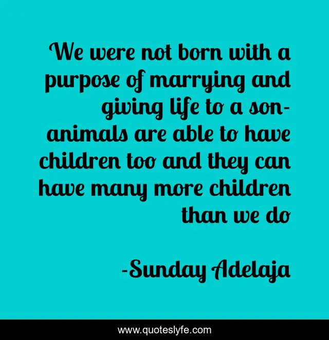 This page presents the quote "We were not born with a purpose of marrying and giving life to a son-animals are able to have children too and they can have many more children than we do". Author of this quote is Sunday Adelaja. This quote is about animals, marriage, procreation, birth, children, purpose,.