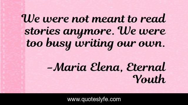 This page presents the quote "We were not meant to read stories anymore. We were too busy writing our own.". Author of this quote is Maria Elena, Eternal Youth. This quote is about life, soul-searching, poetry, library, wisdom, books, reading,.