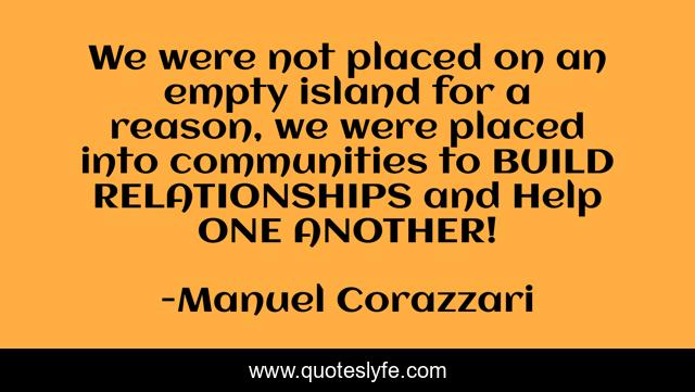 This page presents the quote "We were not placed on an empty island for a reason, we were placed into communities to BUILD RELATIONSHIPS and Help ONE ANOTHER!". Author of this quote is Manuel Corazzari. This quote is about relationships, people, purpose, help,.