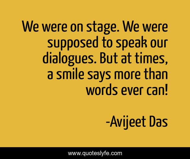 This page presents the quote "We were on stage. We were supposed to speak our dialogues. But at times, a smile says more than words ever can!". Author of this quote is Avijeet Das. This quote is about dialogues, stage-of-life, smile-happiness-peace, writers, actors, words, smile, happiness, stage,.