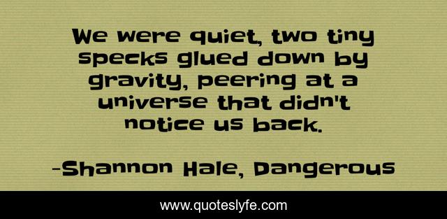 This page presents the quote "We were quiet, two tiny specks glued down by gravity, peering at a universe that didn't notice us back.". Author of this quote is Shannon Hale, Dangerous. This quote is about universe, gravity, space,.