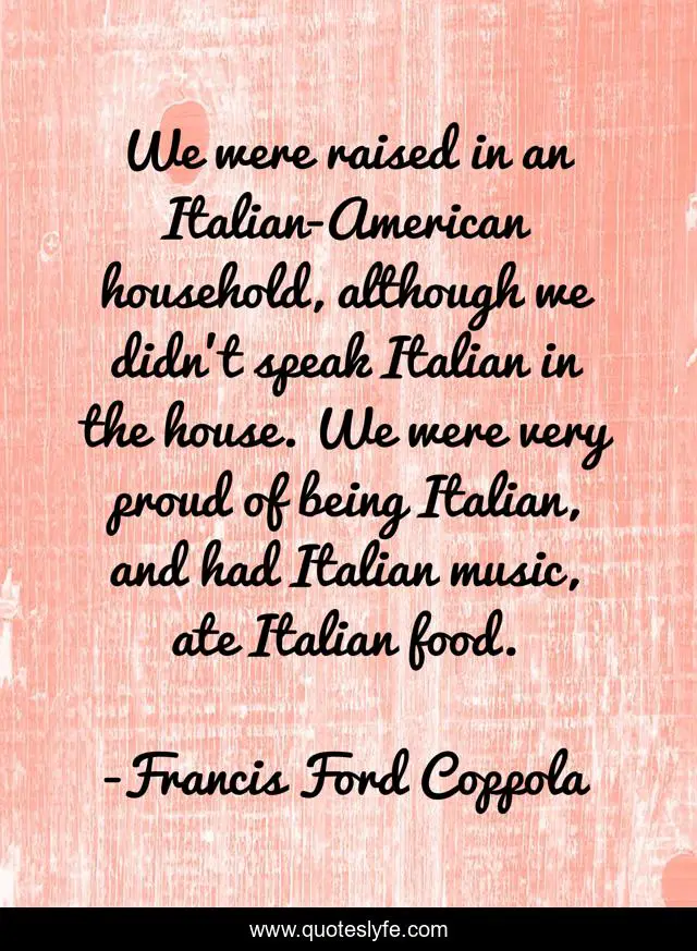This page presents the quote "We were raised in an Italian-American household, although we didn't speak Italian in the house. We were very proud of being Italian, and had Italian music, ate Italian food.". Author of this quote is Francis Ford Coppola. This quote is about food, proud, speak,.