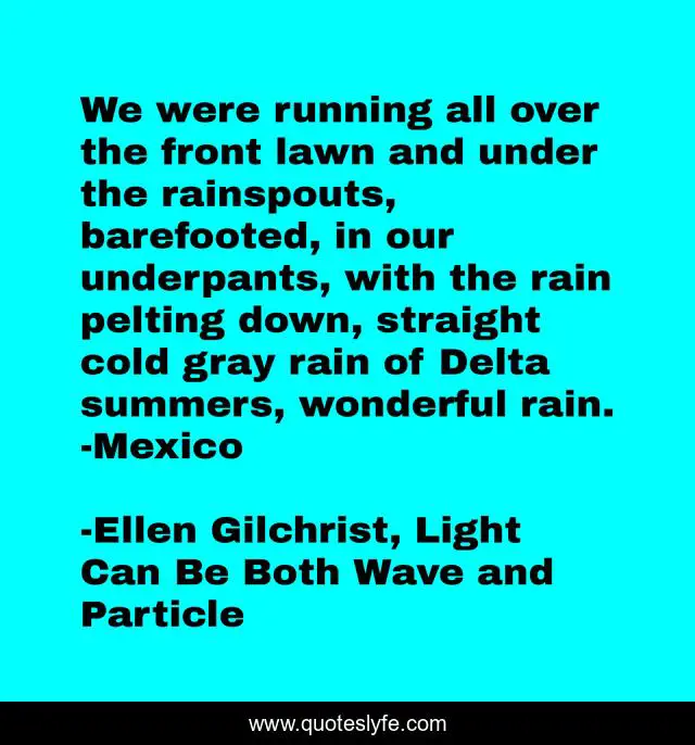 This page presents the quote "We were running all over the front lawn and under the rainspouts, barefooted, in our underpants, with the rain pelting down, straight cold gray rain of Delta summers, wonderful rain. -Mexico". Author of this quote is Ellen Gilchrist, Light Can Be Both Wave and Particle. This quote is about weather, mississippi-authors, rain,.