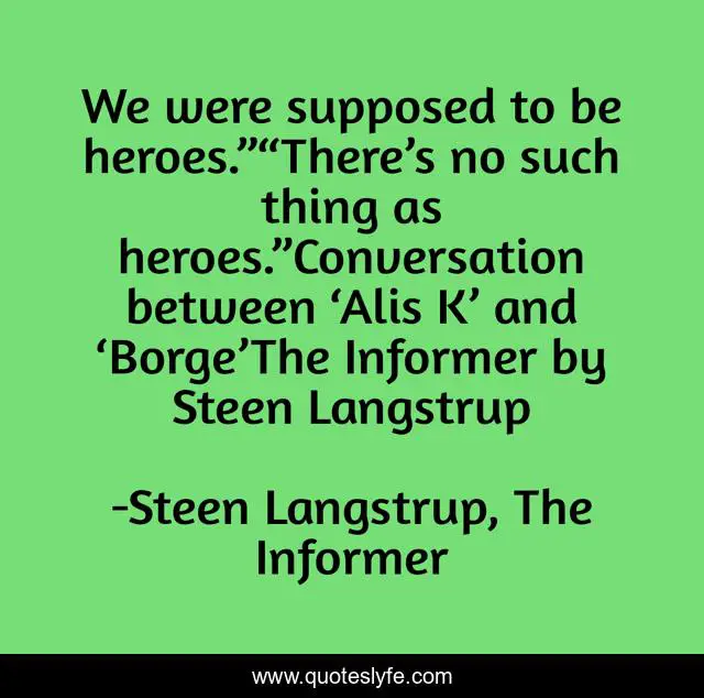 This page presents the quote "We were supposed to be heroes.”“There’s no such thing as heroes.”Conversation between ‘Alis K’ and ‘Borge’The Informer by Steen Langstrup". Author of this quote is Steen Langstrup, The Informer. This quote is about scandinavian-mysteries, heroes, ww2,.